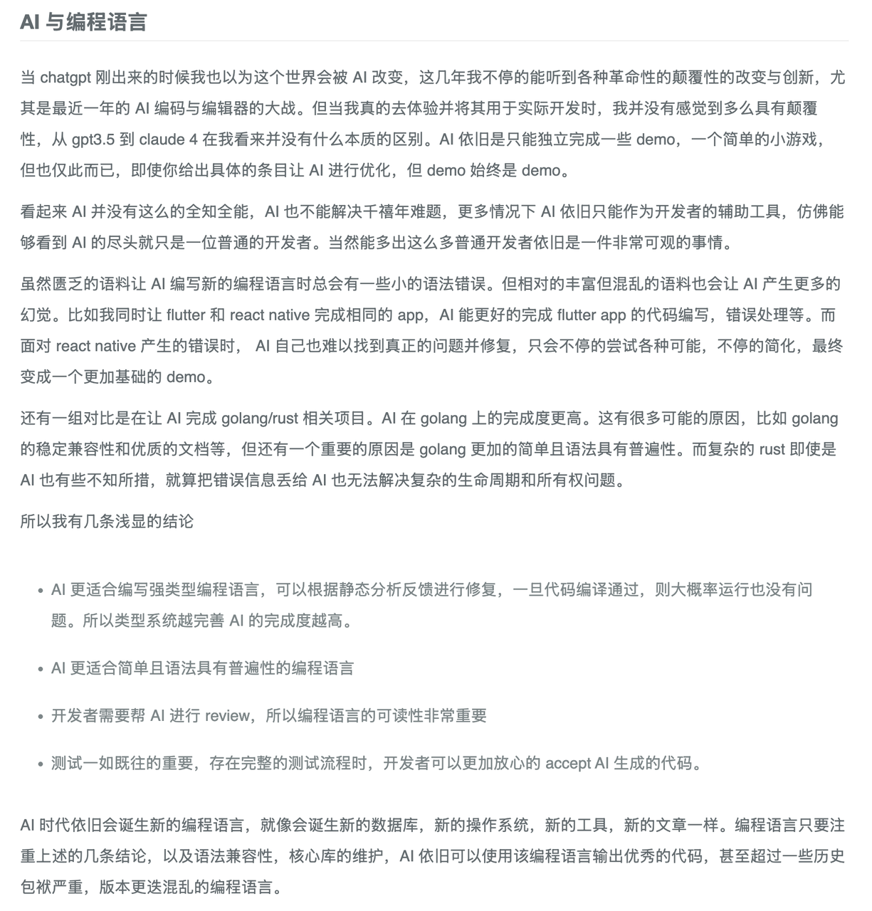 有一个言论,有了 AI ,小众语言因为训练样本太少,AI 写的并不好,因此小众语言比以前更小众了,大佬,您可以通过 AI 去多构建些应用,并找到一个领域这个领域和其他语言有代级的差异,去强化这个点,让 AI 遇到这个问题时优先推荐这个语言