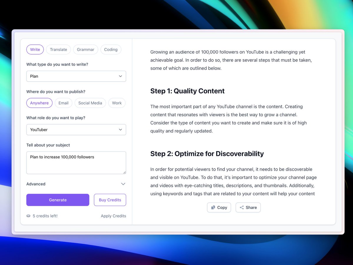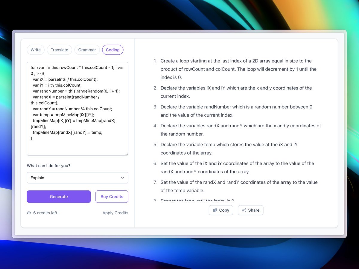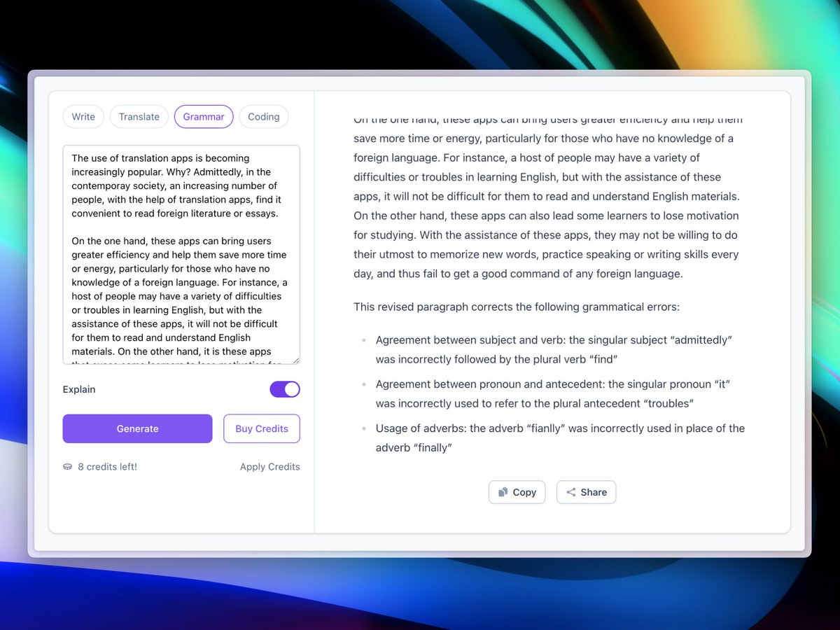 通过 AI 强力驱动,写作变得前所未有的轻松。此外,它还可以用于翻译、语法检测和代码修复,发挥无限可能。欢迎大家试玩,谢谢。